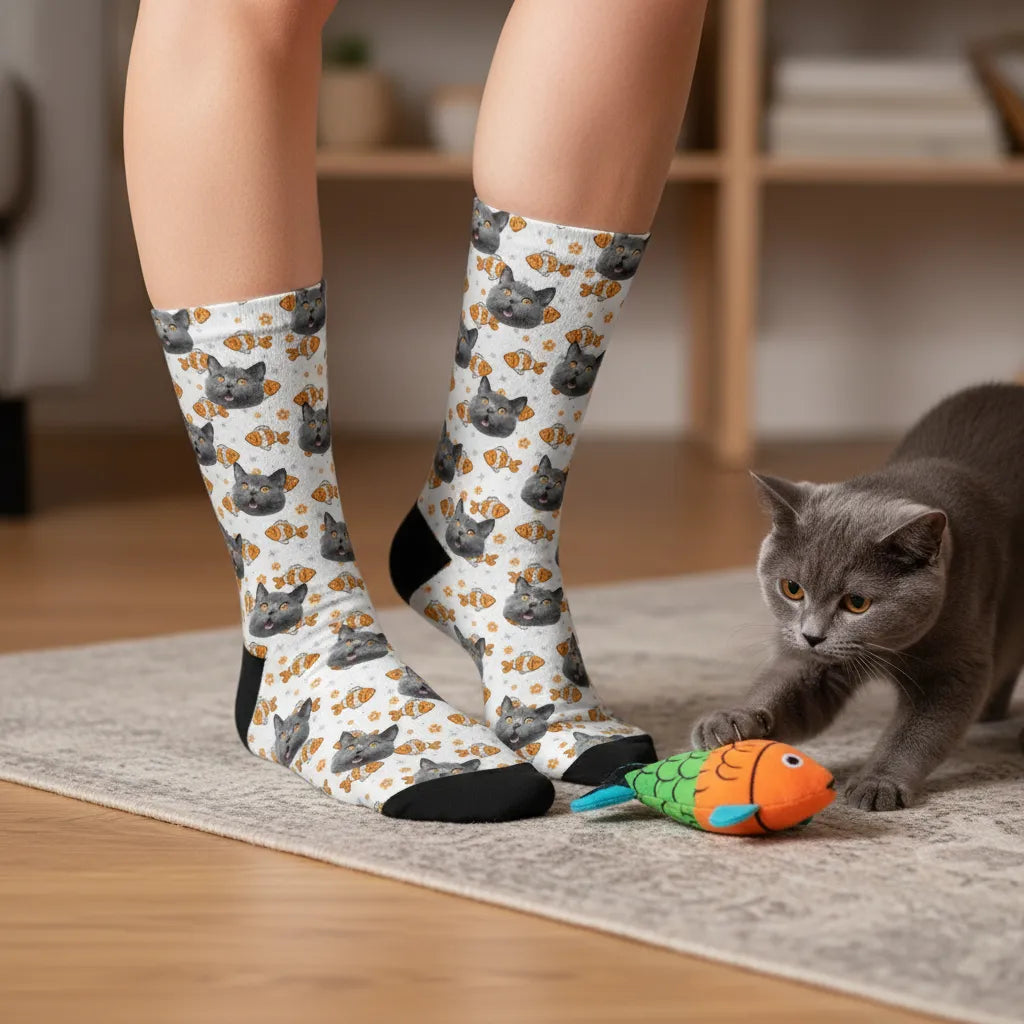 Skarpetki z Twarzą Kota i Złotymi Rybkami. Wyjątkowe skarpetki z twarzą Twojego kota, ozdobione złotymi rybkami. Idealny pomysł na prezent dla miłośnika zwierząt, który ceni sobie unikalne dodatki.