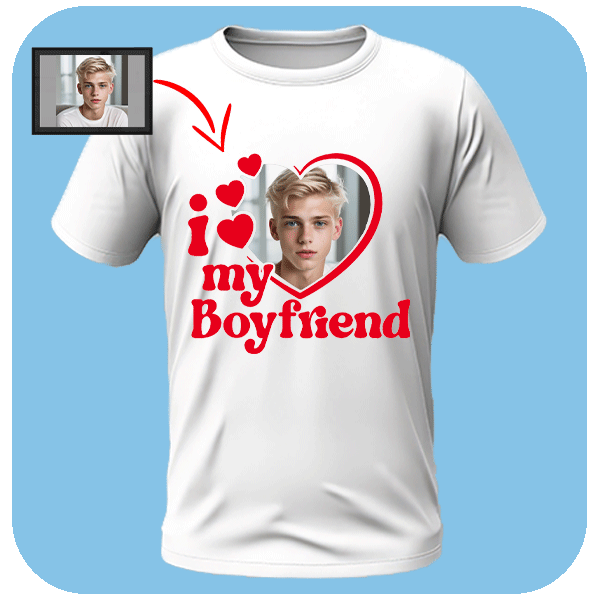Koszulka I Love My Boyfriend ze Spersonalizowanym Zdjęciem. Idealny prezent dla zakochanych Koszulka z własnym zdjęciem twojego chłopaka i słodkim napisem I Love My Boyfriend Poczuj się blisko niego każdego dnia