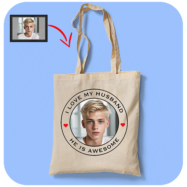 Stwórz personalizowaną torbę bawełnianą z napisem I Love My Husband i Twoim zdjęciem. To wyjątkowy produkt, który łączy praktyczność z indywidualnym charakterem. Idealna jako prezent na rocznicę, walentynki lub każdą inną okazję, torba stanie się ulubionym dodatkiem Twojej żony. Wytrzymały materiał i precyzyjny nadruk gwarantują długotrwałe użytkowanie.